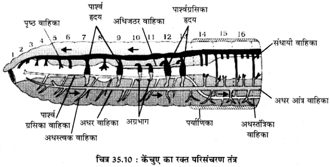 – रक्त परिसंचरण तंत्र बंद प्रकार का होता है। इसमें रुधिर वाहिनियाँ एवं हृदय सम्मिलित हैं। रुधिर (Blood) में तरल पदार्थ प्लाज्मा का बना होता है। हीमोग्लोबिन के कारण रक्त का रंग लाल होता है। हीमोग्लोबिन प्लाज्मा में घुला होता है।