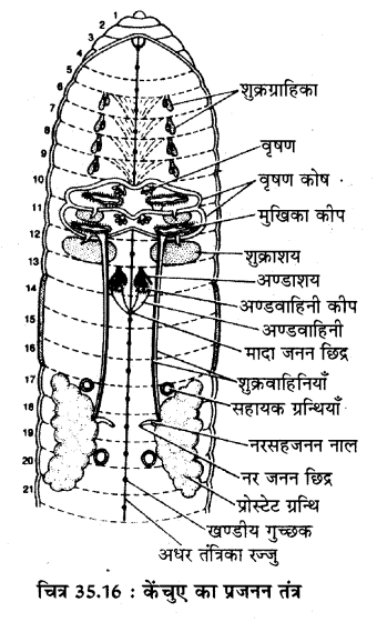– केंचुआ एक द्विलिंगी (Hermaphrodite) या उभयलिंगी (Monoecious) जन्तु है। इसमें पुपूर्वता (Cross Fertilization) पाया जाता है।