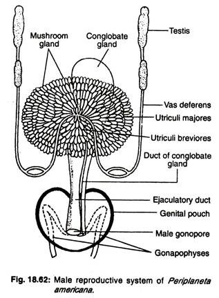 – नर कॉकरोच में जननांग एक जोड़ी वृषण (Testis), शुक्र वाहिकाएँ (Vasdeference), स्खलन वाहिनी (Ejaculatory duct), छत्ररूपी ग्रन्थि (Mushroom gland) तथा फैलिक ग्रन्थि (Phallic gland) होते हैं। इसके अतिरिक्त नर में गोनोपोफाइसिस (Gonopophyses) नामक बाह्य जननांग (External genitalia) भी होते हैं।