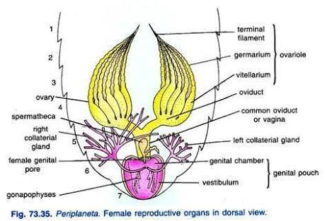 – मादा कॉकरोच के जननांग में एक जोड़ी अण्डाशय, अण्डवाहिनी, योनि, शुक्रग्राहिका तथा कोलेटीरियल ग्रन्थियाँ होती हैं। इसके अतिरिक्त मादा में बाह्य जननांग अथवा गोनोपोफाइसिस उपस्थित होते हैं।
