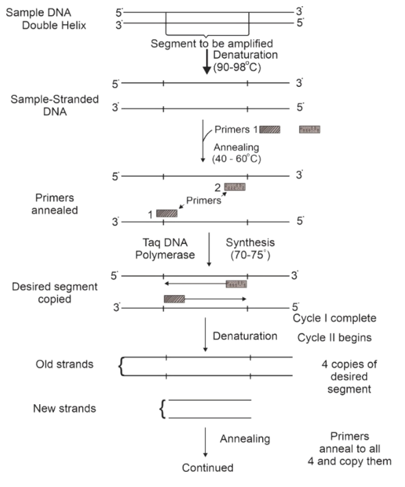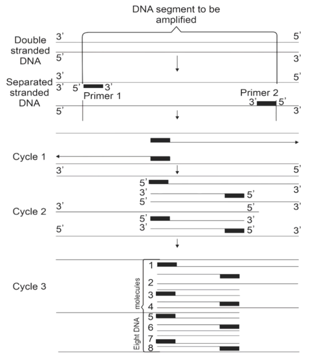 – PCR विधि के विभिन्न चरणों का आरेखीय प्रदर्शन जिसमें DNA खण्ड प्रवर्धन हेतु उपयोग में लिए जाने वाले प्रारम्भक इस खण्ड के 3′ छोर के सम्पूरक होते हैं।