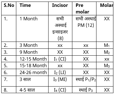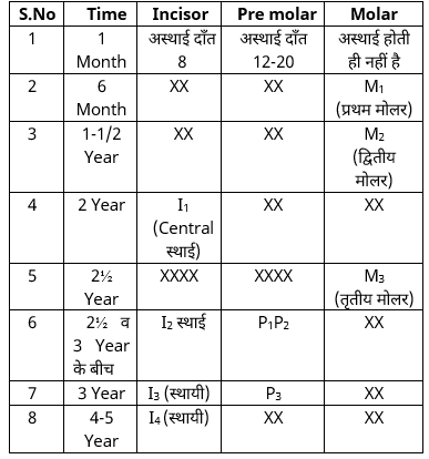 –  चौथे सप्ताह से एक माह की अवधि में सभी अस्थायी अग्रचवर्णक (Premolar) दंत आ जाते हैं।