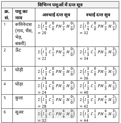 –  मानव, गाय, भैंस व बकरी में कुल 32 दाँत होते हैं जिसमें से 20 जीवन में दो बार आते हैं व 12 दंत एक बार आते हैं।