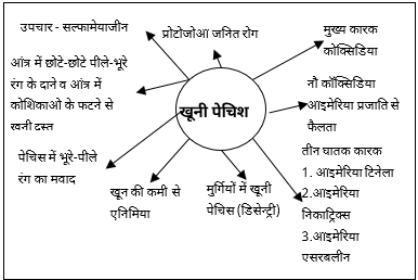 – खूनी पेचिश का मुख्य कारक कॉक्सिडिया (Coccidia) होता है जो गोल, छोटे-छोटे प्रोटोजोआ होते हैं।