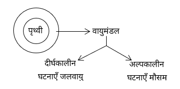 ● किसी स्थान की दीर्घकालीन वायुमंडलीय दशाएँ जलवायु तथा अल्पकालीन वायुमंडलीय दशाएँ मौसम कहलाती है।