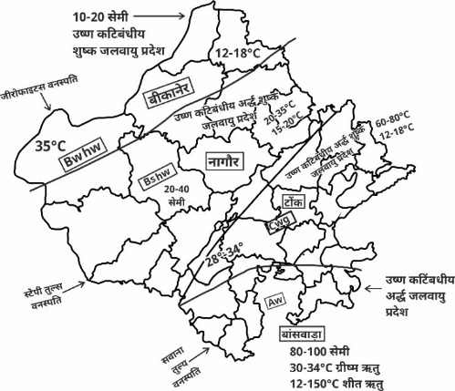 ● राजस्थान के दक्षिण का भाग उष्ण कटिबंधीय क्षेत्र में आता है जबकि अधिकांश भाग उपोष्ण कटिबंध में आता है, जहाँ ग्रीष्म और शीतकाल में तापमान सामान्य रहता है।