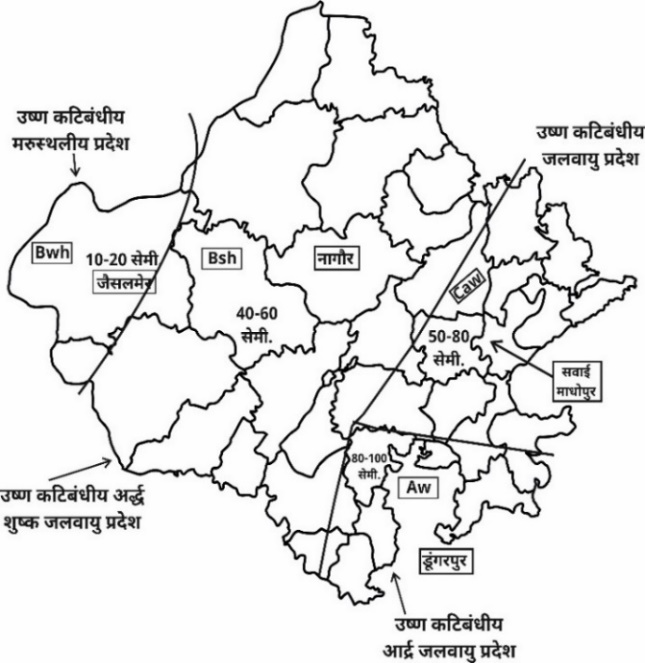● 50 सेमी. सम वर्षा रेखा राजस्थान को दो भागो में विभाजित करती है।