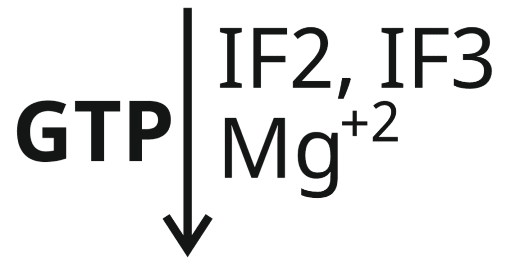 – यह 30s – mRNA वाला complex शुरुआती t-RNA से जुड़ जाता है। जिसके फलस्वरूप 30s mRNA fomyl met. t-RNA complex बन जाता है। इस प्रक्रिया में GTP का अणु काम आता है।