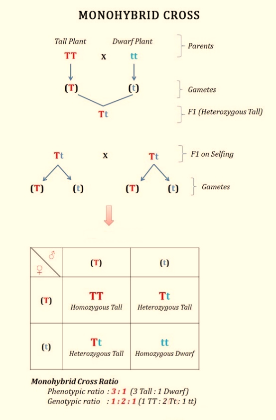 – मेण्डल ने वंशागति के अध्ययन के लिए विपरीत लक्षणों के एक युग्म विकल्पी (Alleles) के मध्य संकरण करवाया। इस हेतु उसने शुद्ध रूप से लम्बे (Pure tall) व शुद्ध बौने (Pure dwarf) पौधों के मध्य संकरण करवाया। प्रभावी लक्षण लम्बे (Tall) को T से तथा अप्रभावी लक्षण बौने (Dwarf) को t से प्रदर्शित किया।